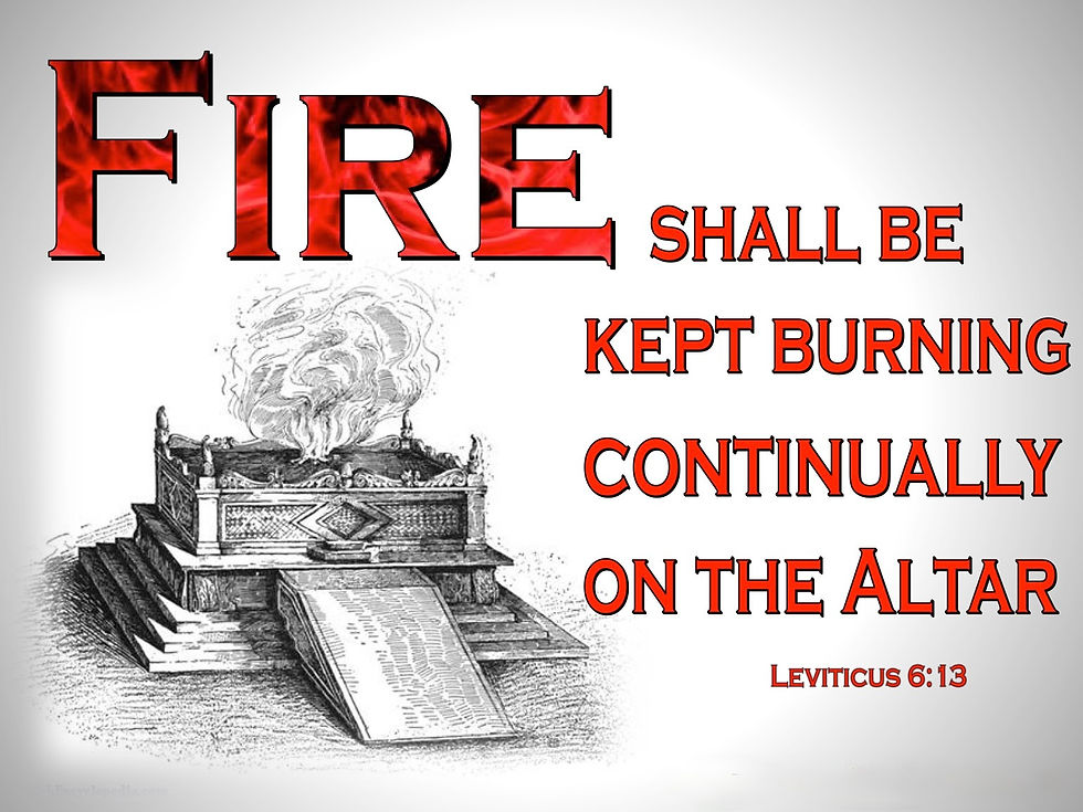 8 [b]Then the Lord spoke to Moses, saying, 9 “Command Aaron and his sons, saying, ‘This is the law of the burnt offering: the burnt offering shall remain on the hearth that is on the altar all night until morning and the fire is to be kept burning on the altar. 10 The priest is to put on his linen robe, with his linen undergarments next to his body. Then he shall take up the ashes of the burnt offering which the fire has consumed on the altar and put them beside the altar. 11 Then he shall take off his garments and put on something else, and take the ashes outside the camp to a (ceremonially) clean place. 12 The fire on the altar shall be kept burning; it shall not [be allowed to] go out. The priest shall burn wood on it every morning, and he shall arrange the burnt offering on it and offer the fat portions of the peace offerings up in smoke on it. 13 The fire shall be burning continually on the altar; it shall not [be allowed to] go out.